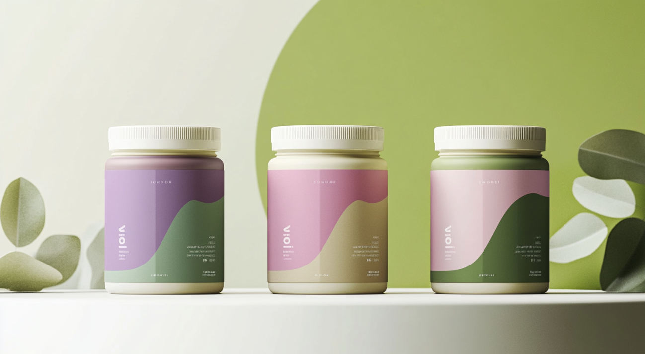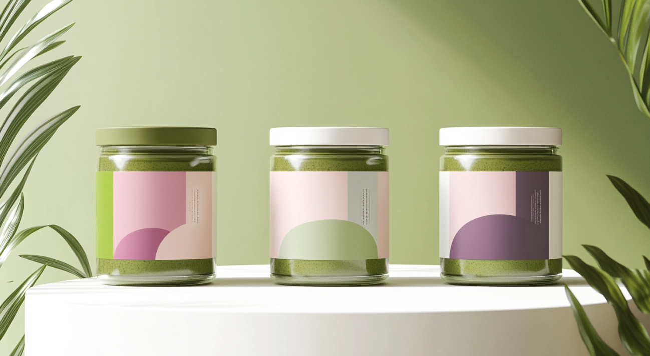 [9] [10] mj: jars in a modern matcha tea packaging collection in a cohesive, premium design. Each jar is for a specific matcha type: green, pink, or purple. Bold color blocks and soft, organic geometric shapes that reflect the specific flavor: earthy greens for green matcha, soft pinks for pink matcha, and vibrant purples for purple matcha. Smooth, matte texture with minimalist labels and clean typography. All jars follow the same unified aesthetic while each color pattern represents its unique matcha flavor --v 6.1