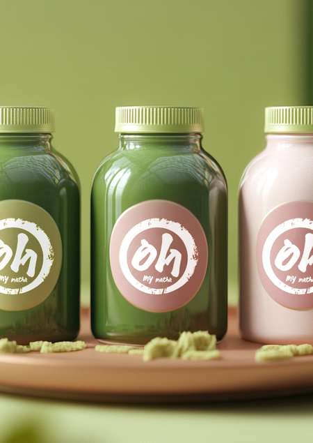 [6] mj: Modern matcha tea packaging collection in a cohesive, premium design. Each bottle is for a specific matcha type: green, pink, or purple. Bold color blocks and soft, organic geometric shapes that reflect the specific flavor: earthy greens for green matcha, soft pinks for pink matcha, and vibrant purples for purple matcha. Smooth, matte texture with minimalistic labels and clean typography, placed vertically. All bottles follow the same unified aesthetic while each color pattern represents its unique matcha flavor. --v 6.1