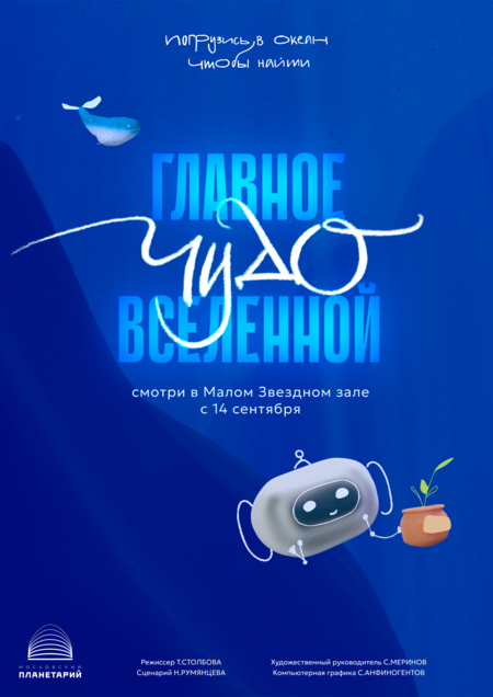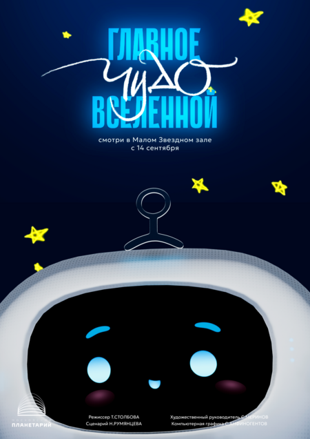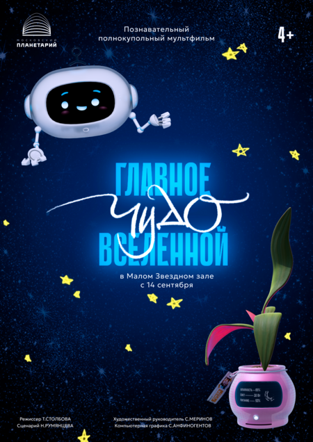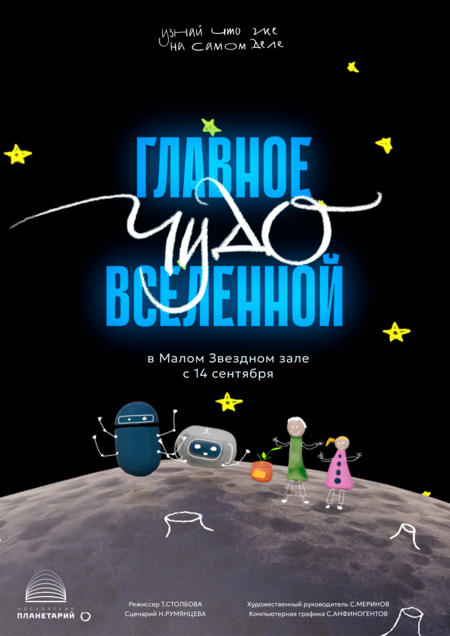 Главное чудо Вселенной — новый полнокупольный мультфильм Московского Планетария для Малого Звездного зала. Фильм рассчитан на детскую аудиторию и рассказывает о путешествиях робота Роберта и цветка Рэо в поисках Чуда.