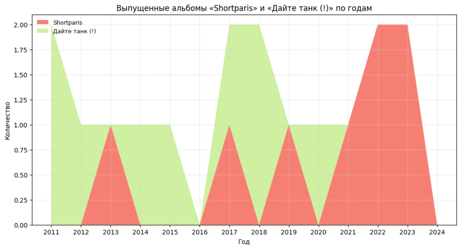Таким образом, как видно из представленного выше графика, группа «Дайте танк (!)» выпустила больше альбомов, чем «Shortparis».