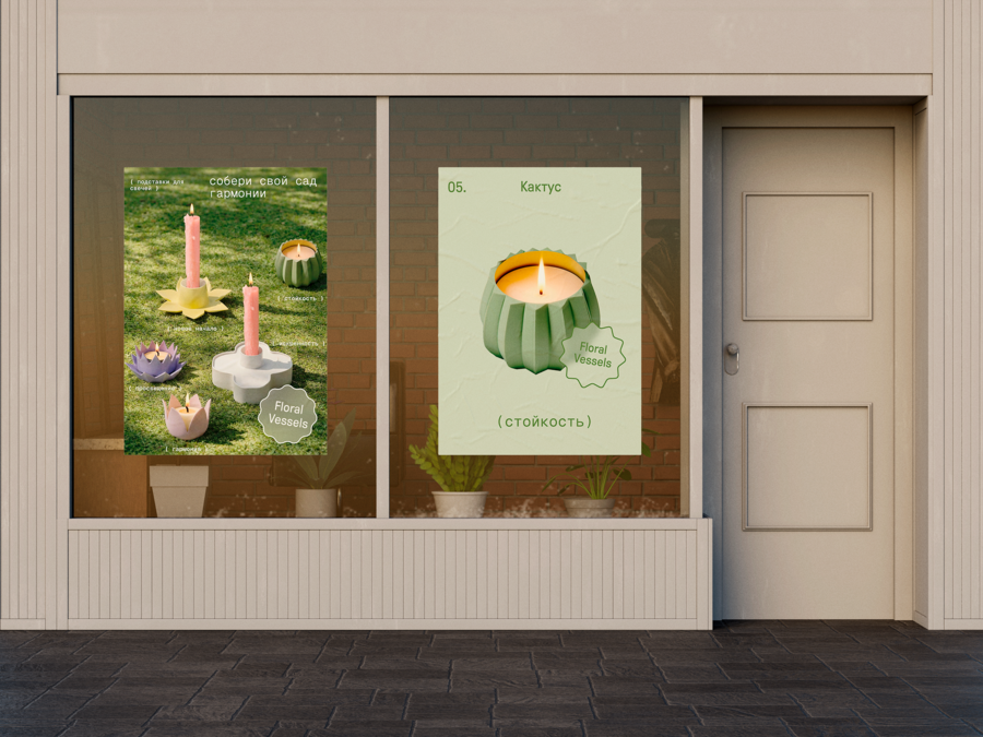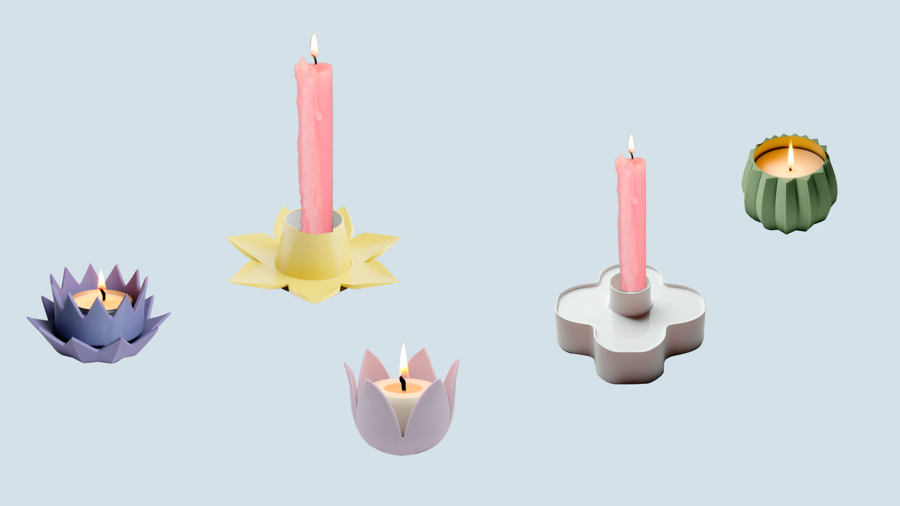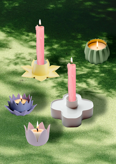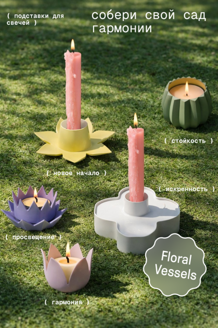 Коллекция подставок для свечей, где каждый объект — это интерпретация цветка или растения, выполненная из матового пластика в мягких, успокаивающих тонах.