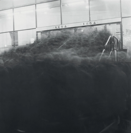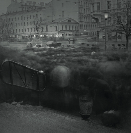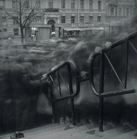 Лестница железнодорожной платформы «Проспект Ленина», 1994 год, Алексей Титаренко; Толпа у входа в метро, из серии «Город теней», 1993 год, Алексей Титаренко