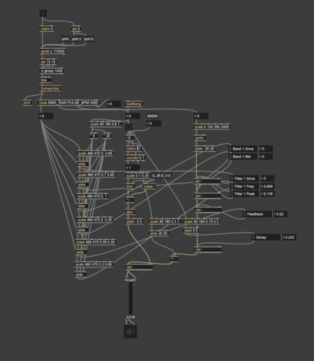 Основной звук генерировался из датчика GSR. Датчик EMG управлял параметрами эффектов. Параметр BPM из датчика пульса изменял значения slide у EMG и путем сайдчейна немного компенсировал итоговый сигнал.