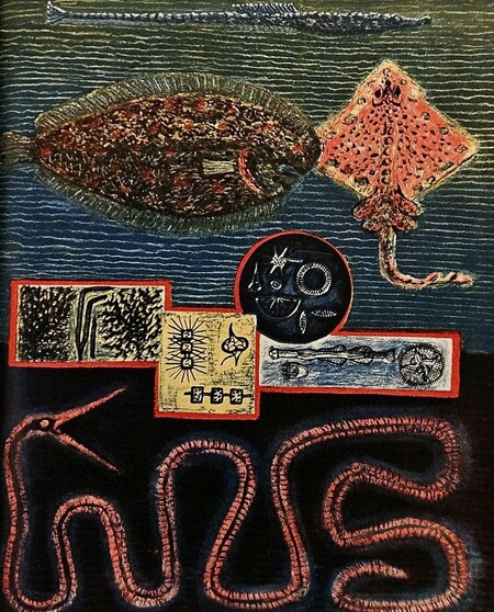 Рыбы — ещё одна страсть художника. Если в книге хоть как-то упоминается вода, то рядом обязательно будут рыбы. На полотнах Юло изображал рыб иначе: это сложные, метафизические образы. Присутствует желание не просто перенести действительность на холст, но передать суть объекта, добавить собственное восприятие.