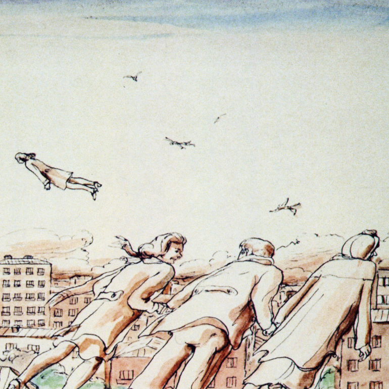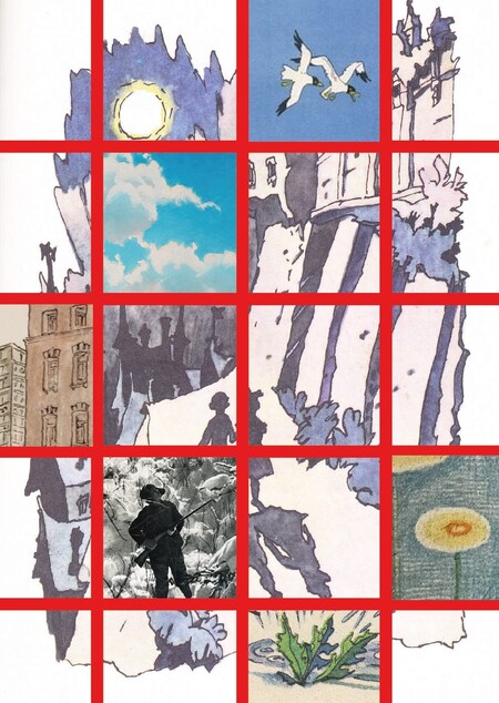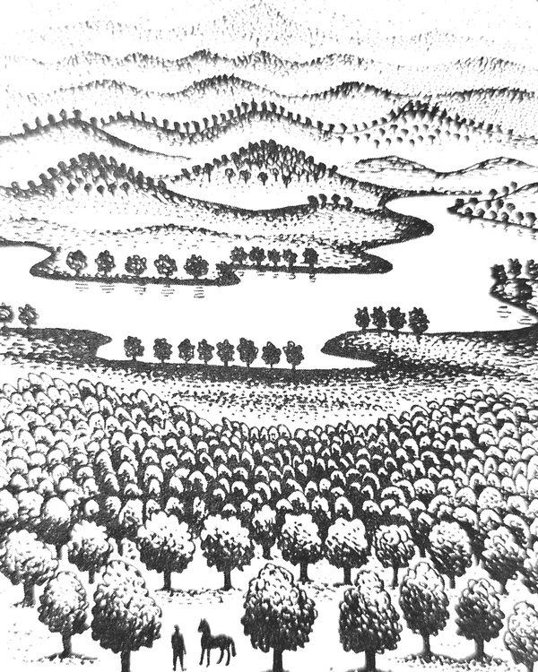 Немного позже заметна игра с ритмом и бесконечной повторяемостью изображенного. С помощью такого приёма передаётся воздух пространства. Можно даже сказать, что восприятие иллюстрации становится легче, поскольку глаз самостоятельно находит повторяющиеся элементы и воспринимает их как силуэтные пятна. Ритм помогает распределить эти пятна по странице.