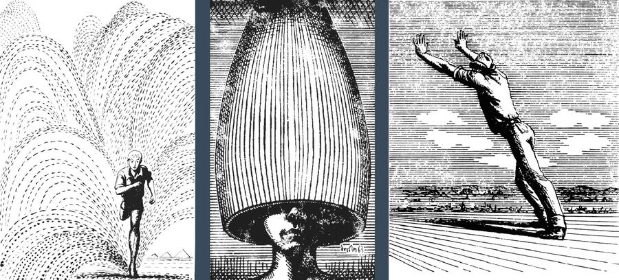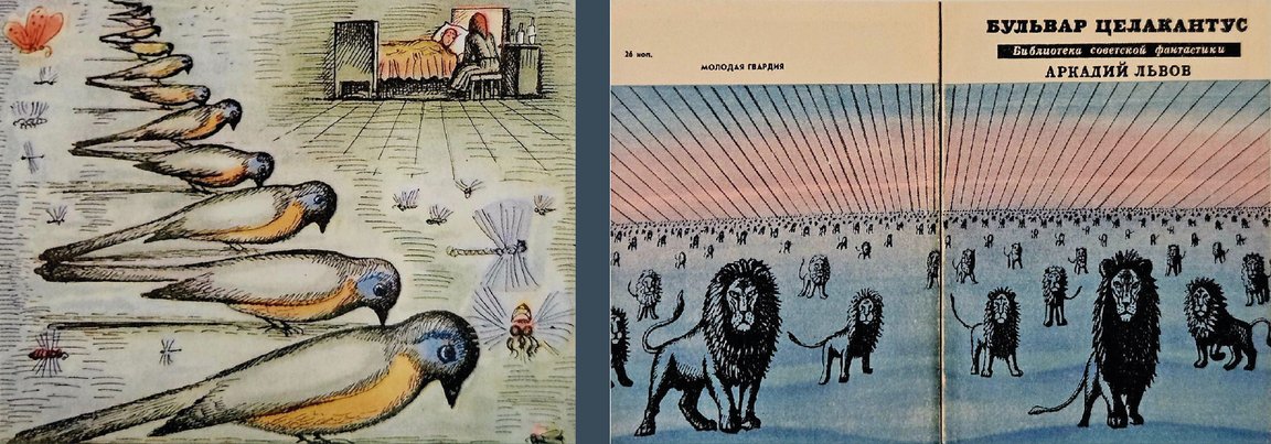 Иллюстрация к произведению «Бульвар Целакантус», А. Львова, 1967 г. / Иллюстрация к произведению «Путь марсиан», А. Азимова, 1966 г. / Иллюстрация к произведению «Всё живое», К. Саймака, 1968 г.