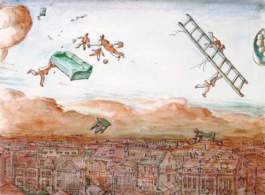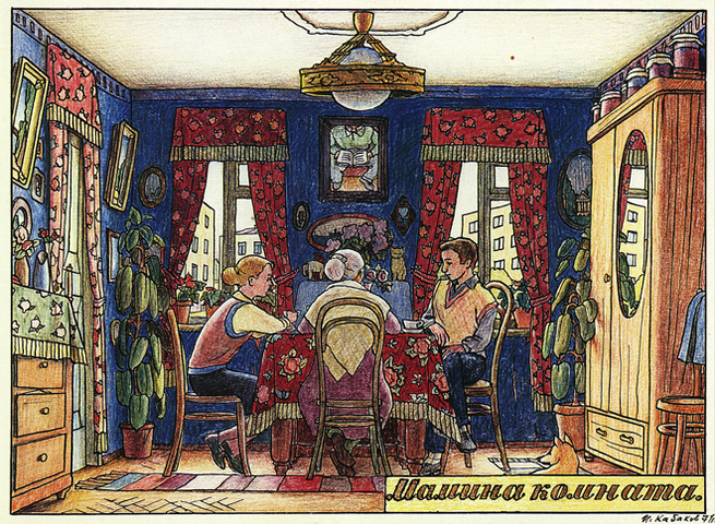 Кабаков делает акцент на целостное оформление книги, на композицию, а не на внутренние переживания отдельных персонажей. Позже такой полный и цельный взгляд пригодился ему и в инсталляциях, где к длине и ширине добавился еще и объём.