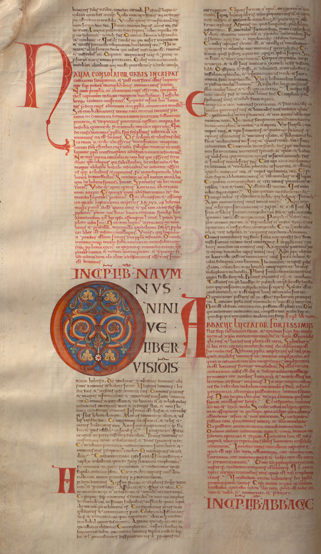 Инципит данного манускрипта уже занимает значительную часть на листе, шириной он такой же, как и текст. Внутри литеры мы можем разглядеть орнамент, множество переплетений и природные мотивы. Оформление этого инципита уже выходило за рамки функциональности, он выполнял и декоративную функцию, ведь рукопись использовалась для чтения в кругу знати и церковных деятелей.