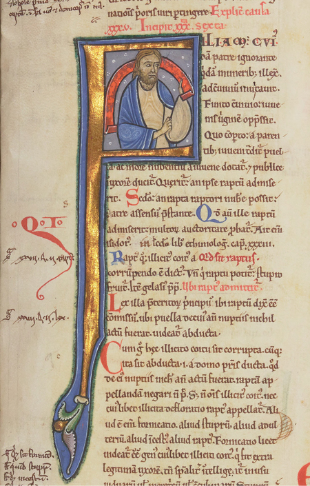 В этой рукописи инципит выполнен в ярких цветах, буква вписана в прямоугольник и украшена спиральным орнаментом, а композиция немного выходит за текст. Манускрипт был юридическим сборником, поэтому декоративных элементов мало, в основном инципит помогал в навигации.