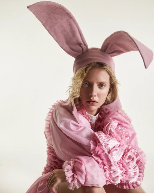 Спустя годы этот проект стал моим разрешением на эксперимент: что если довести подавленную детскость до гротеска, до кричащей, почти театральной невинности? Вместе с подругой-стилистом мы создали мир преувеличенной сладости: розовые тона, платья, утопающие в оборках, как свадебный торт, гигантские заячьи уши и огромные банты.