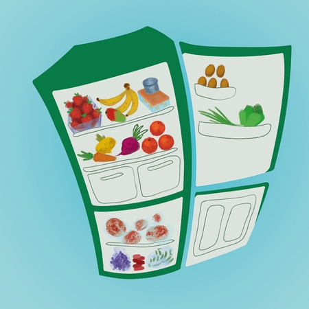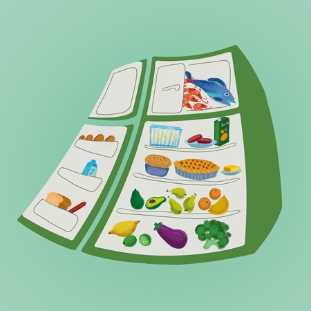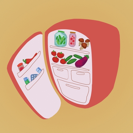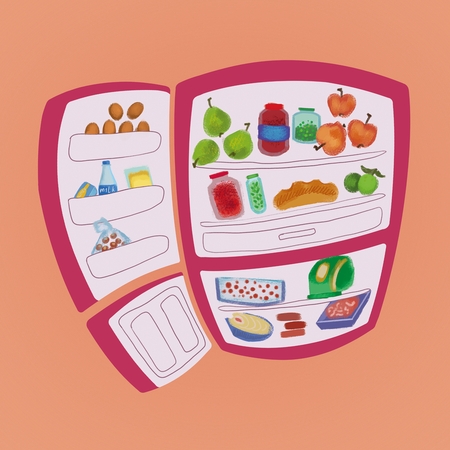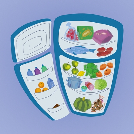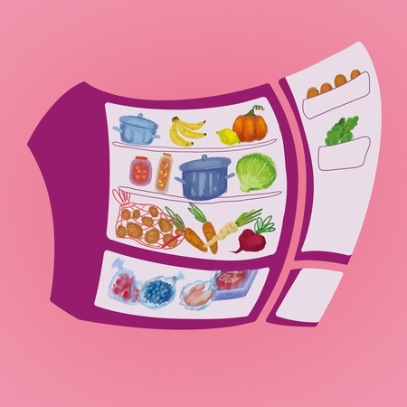 Было нарисовано 13 иллюстраций, 12 из которых специально под каждый месяц. Я использовала общую стилистику, где холодильник становится простой формой без мелких деталей, а продукты нарисованы текстурной кистью.