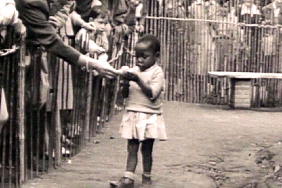 1958 год, добрая посетительница «человеческого зоопарка» в Брюсселе угощает бананом девочку из Конго.