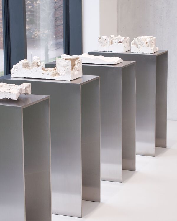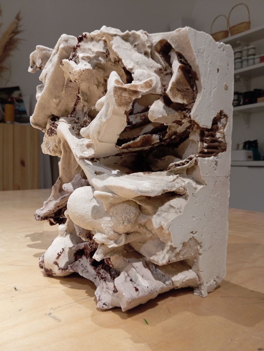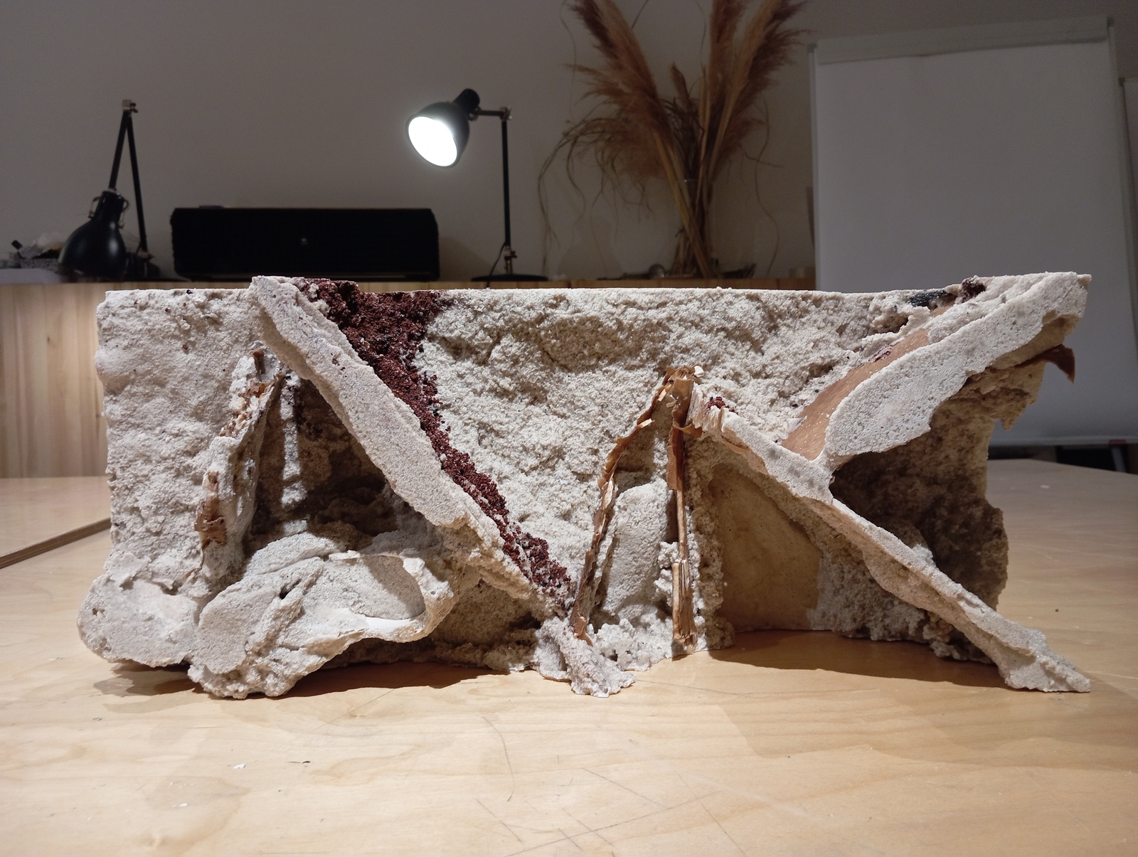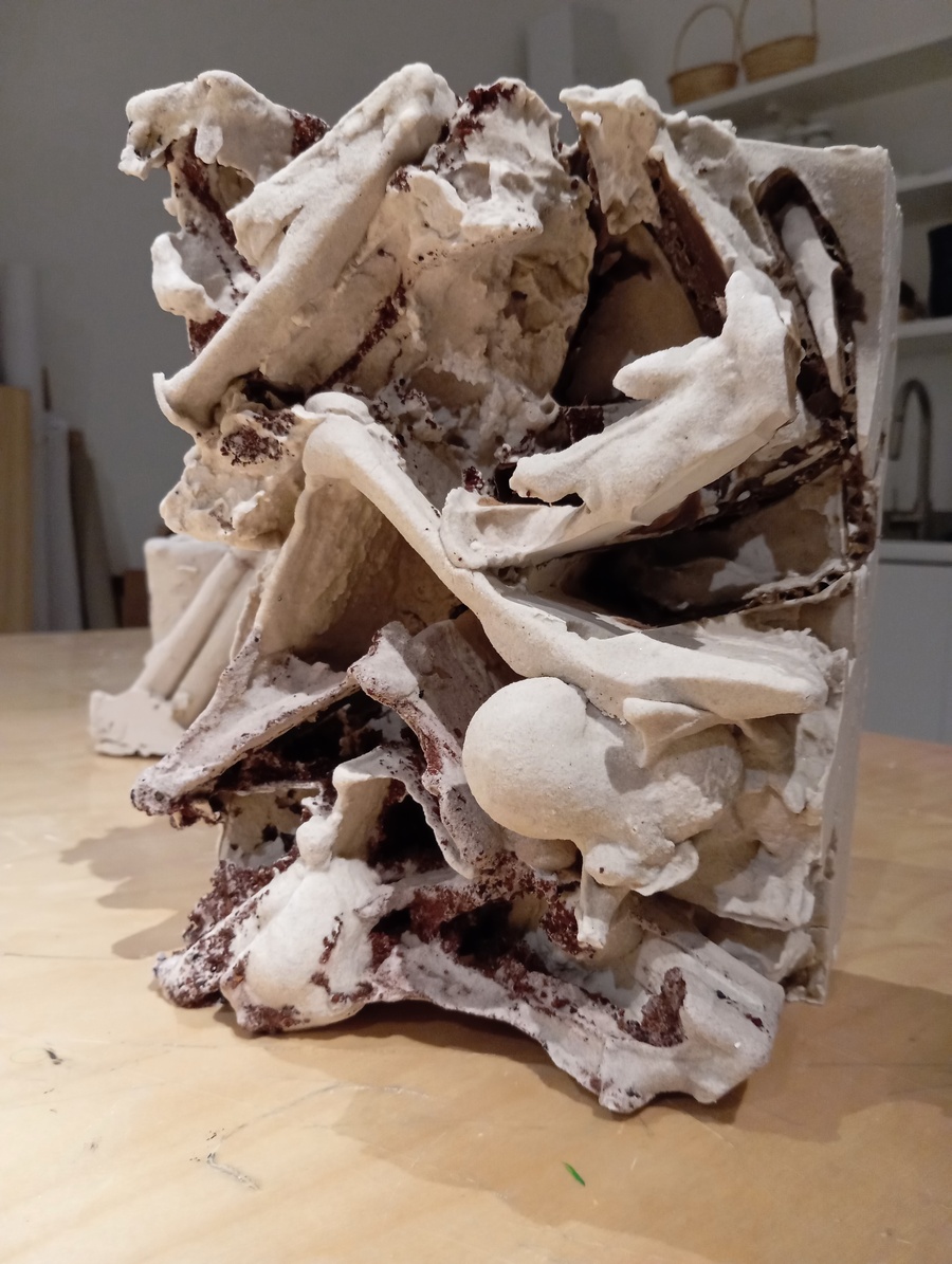 работа с гипсом и песчаной формовкой. работа в A-house. в итоге разработала серию гипсовых объектов на тему множественности и перегородок. вход в новый материал позволяет изучить границы управляемости. интересовали множества, образующиеся паузы, контраст жестких перегородок, взаимодействия текучести гипса.