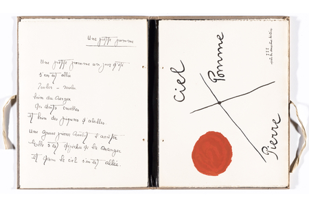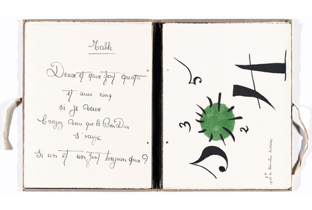 Многие искусствоведы не считают эту книгу livre d’artiste из-за того, что она выполнена в технике пошуар, но это первая книга Миро в качестве иллюстратора, поэтому, я считаю, она должна быть в этом исследовании. «Жила-была птичка-сорока» — это сборник детских песенок. В книге восемь цветных пошуаров, листы скреплены тесёмкой в тканевой папке. Художник использует тут цветовые пятна, чистые цвета, не идеально ровные линии проведены чётко и уверенно. В иллюстрациях нет понятных образов птиц и животных, но есть жизнь, динамика. Иллюстрации гармонично смотрятся рядом с текстом на соседней полосе, текст даже вплетён в сами иллюстрации. Линии задают ритм чтения не меньше, чем текст. Цвет здесь — лишь несколько акцентов, подчёркивающих важные точки, словно рифмы в детском стишке.