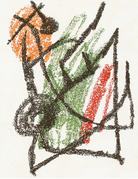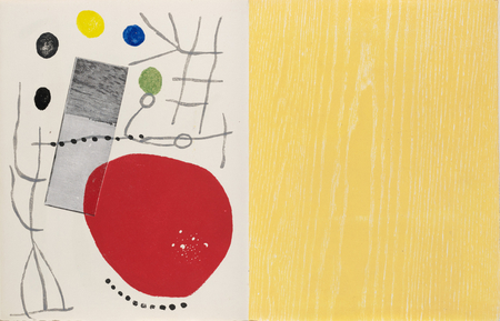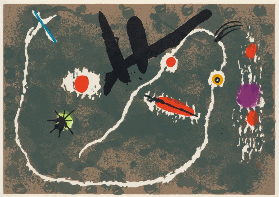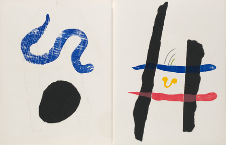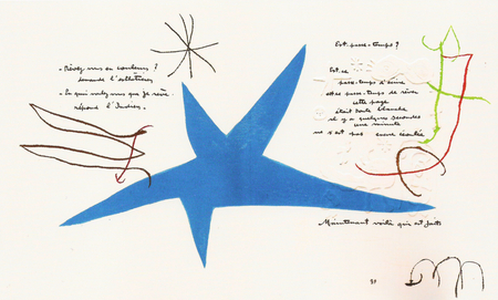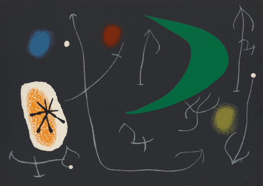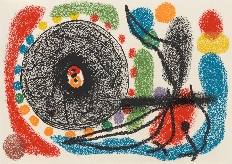 Можно сравнить подход к творчеству Миро с подходом Василия Кандинского. Кандинский описывал точку, линию и пятно как элементы особого языка, который может звучать подобно музыке. Линия у Кандинского — это не просто контур предмета, а самостоятельный «звучащий» жест. У Миро мы видим похожий принцип, но с другой интонацией. Его линия неровная, извилистая, дрожащая, иногда прерывается и продолжается уже в другом направлении, как будто она записывает движение мысли. На многих страницах livre d’artiste чёрная линия связывает цветовые пятна, элементы в единое целое. В результате перед нами не иллюстрация к тексту, а визуальная фраза, которая говорит рядом со словами поэта.