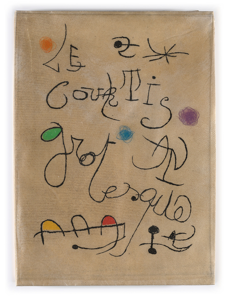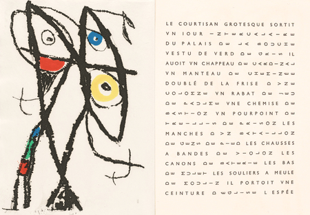 «Гротескный Куртизан» — единственная совместная работа Ильязда (поэта, писателя, типографа и издателя) и Миро. Переговоры об издании велись 20 лет. В книге 23 цветных офорта. На обложке печать на пергаменте. Ильязд интересно располагает текст, чередуя вертикальное и горизонтальное написание. В книге чередуются развороты, состоящие из разрозненных линий, образующих фигуры, фоном, забрызганным краской, и цветными пятнами с более спокойными разворотами с текстом с одной стороны и иллюстрацией, выполненной, неровной линией, с другой. Элементы, присутствующие в других книгах, переместились и сюда: звёзды, круги, месяцы свободные линии, символы. Язык автора трансформируется, фигуры тут составлены из отдельных частей, рваных линий, усиливая гротеск за счёт намеренной деформации. Иллюстрации не контактируют с текстом физически, словно ведут с ним диалог.
