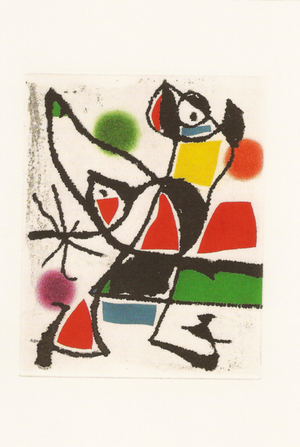 Для поэмы Рене Шара «Молот без хозяина» Миро сделал 26 офортов. Он долго не брался за эту работу, так как не знал как подступиться к загадочному тексту поэмы. Само название книги предполагает абсурд и разрыв с привычной логикой. Визуальный язык Хоана Миро это подхватывает: набор знаков, линий и цветовых пятен образует композицию, где «молот» нигде явно не присутствует, но ощущение силы, удара, напряжения передаётся через ритм и контраст. Миро работает с поэтическим текстом на уровне структуры и энергии, а не буквальной предметности.