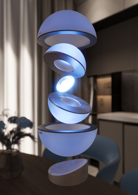 Игрушка-светильник «Люмен» состоит из трех частей — подставки и двух полусфер с подвижной сердцевиной, внутри которой технический блок и линза.
