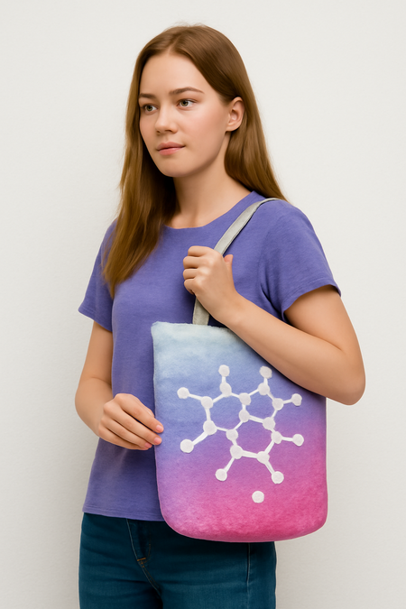 A signature shopping bag in our colors featuring molecules. A girl is holding the bag.
