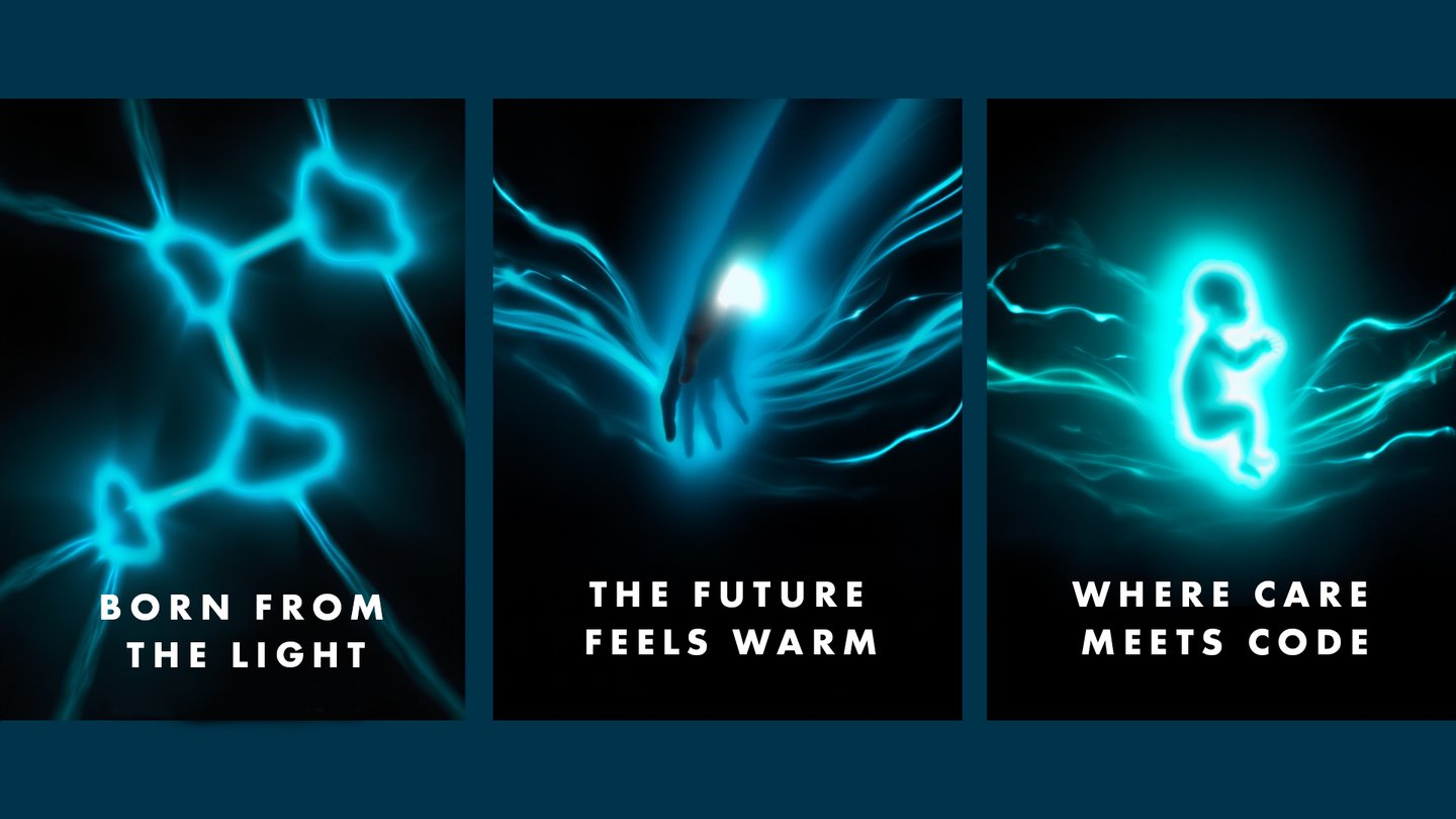 3. промт для Reve: Create a hyperrealistic A4 poster for Papatech, a biotechnology company merging empathy and artificial intelligence. Show a glowing infant silhouette made entirely of light and heat — soft edges, diffused contours, floating in an ambient, ethereal glow. Solid background. Around it, subtle bioluminescent energy waves expand.