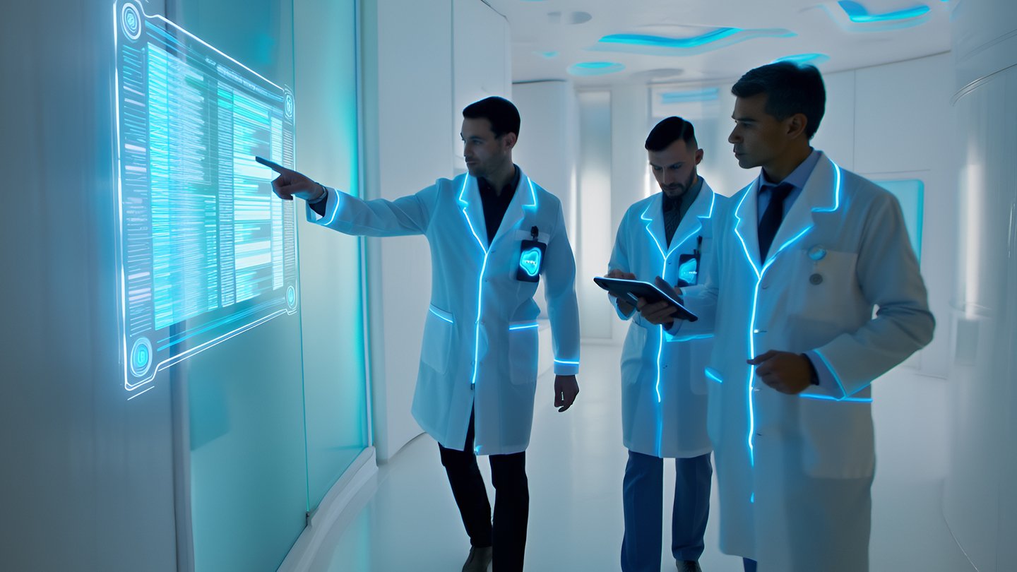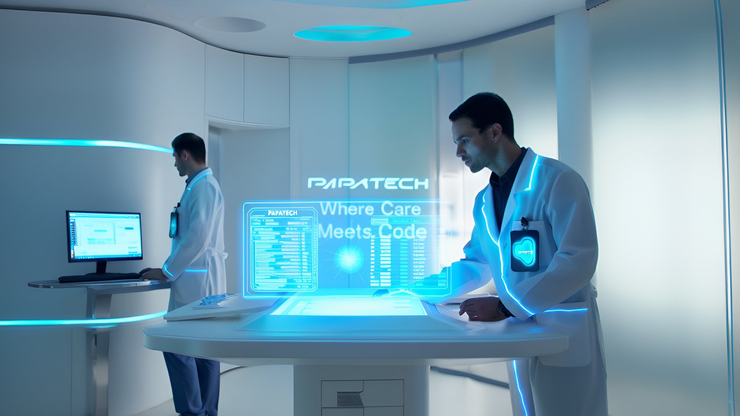 промт для Reve: Cinematic, hyperrealistic interior of Papatech laboratory, a biotechnology company merging empathy and artificial intelligence. Smooth, biomorphic white architecture with cyan-blue neon light veins integrated into the walls and ceiling. Two scientists in futuristic lab coats — white uniforms with glowing cyan seams and Papatech logo patches on their chests. Minimal glowing workstations, holographic panels displaying «Where Care Meets Code». Light is diffused, sacred, and soft — reflected on glossy white and glass surfaces. Atmosphere: quiet, clean, sacred-tech aesthetic, emotional minimalism. Style: cinematic lighting, volumetric glow, high detail, soft diffusion, sacred futurism, realistic human lighting, emotional tech environment. Materials: glass, chrome, white composites, translucent surfaces, neon diffusion.