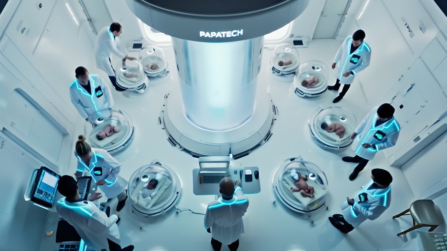 промт для Reve: Create a cinematic, hyperrealistic biotechnology scene for Papatech, a company merging empathy and artificial intelligence. dont change style and colors In the center of the composition — a large glowing biogenic core known as the «Father’s Warmth Battery» — a pulsating, liquid structure of soft light and translucent layers. It emits warm pearlescent energy, radiating through organic cables and translucent tubes that connect to multiple infant capsules arranged in a circular pattern around it. Each capsule contains a newborn, peacefully sleeping in soft light. The capsules are made of translucent bioplastic, glowing from the inside with gentle cyan and pearl tones, their surfaces fluid and biomorphic — like grown from light and water; try different positions.