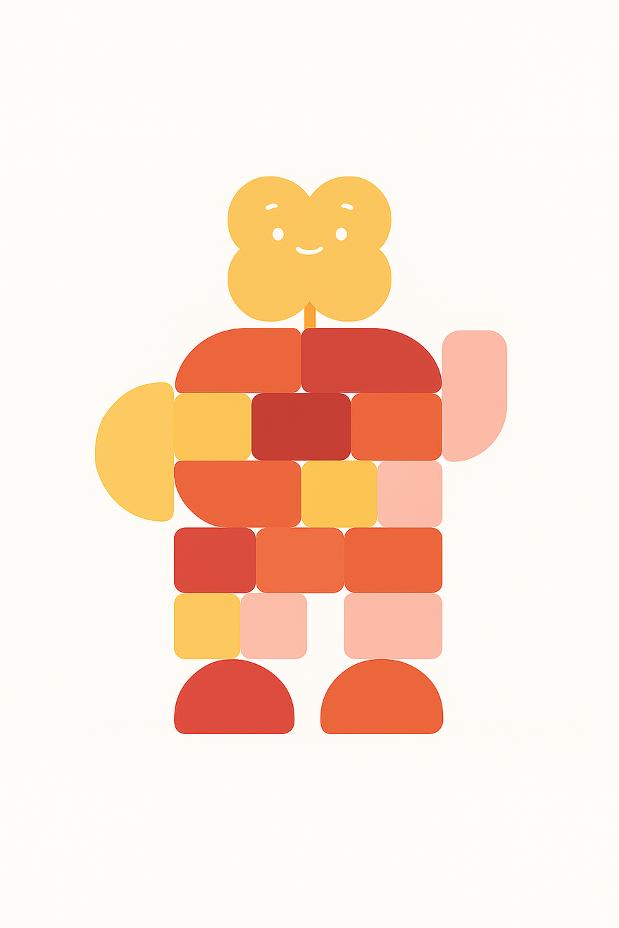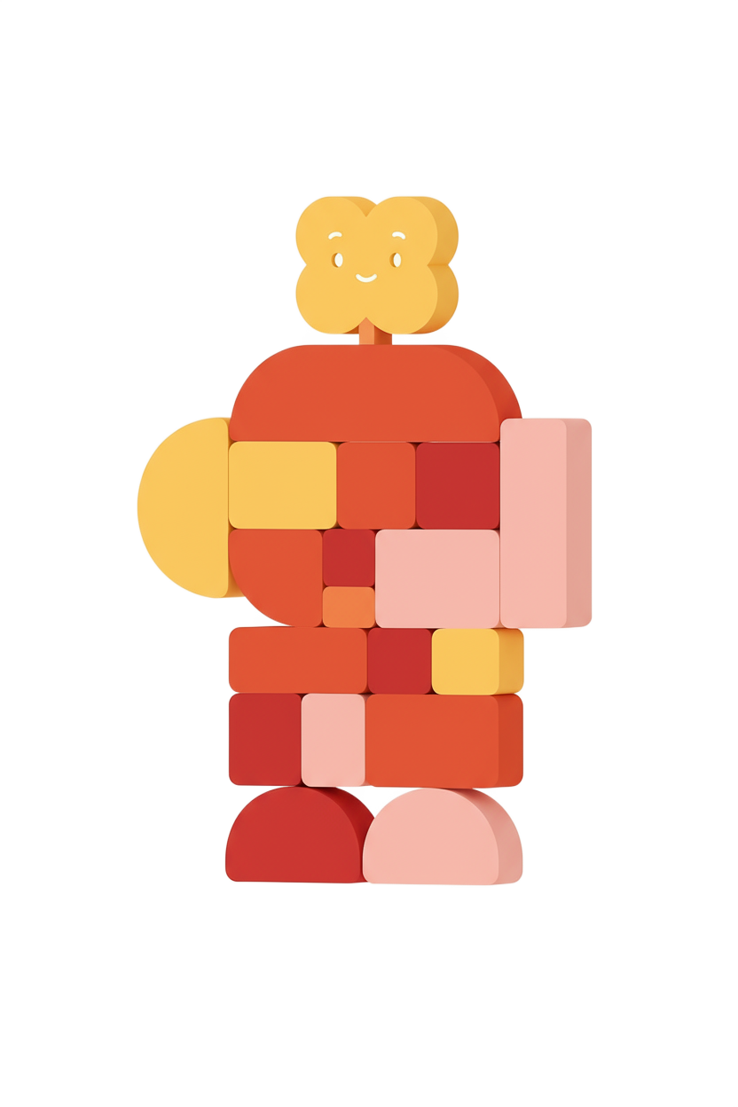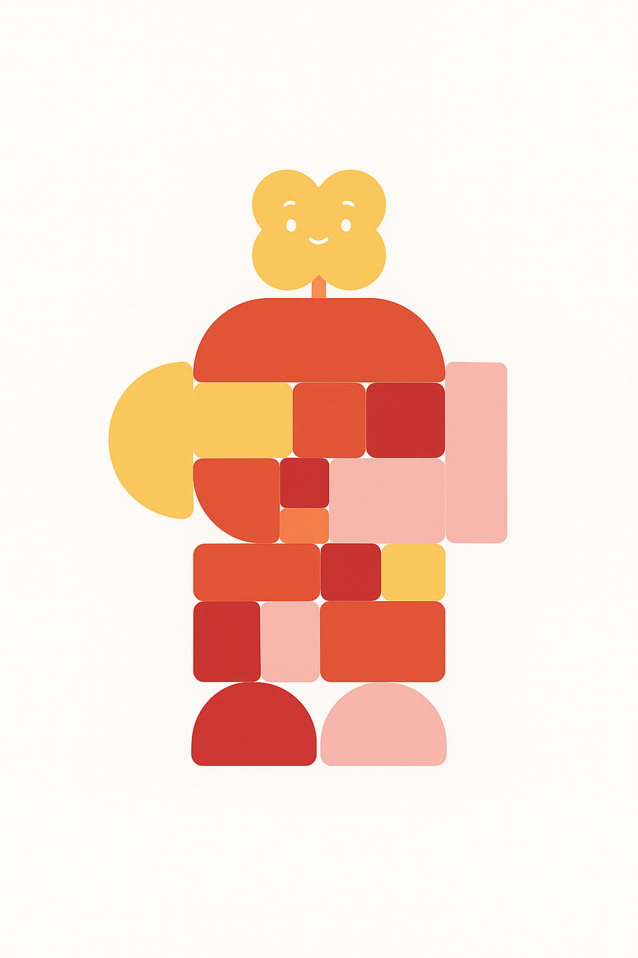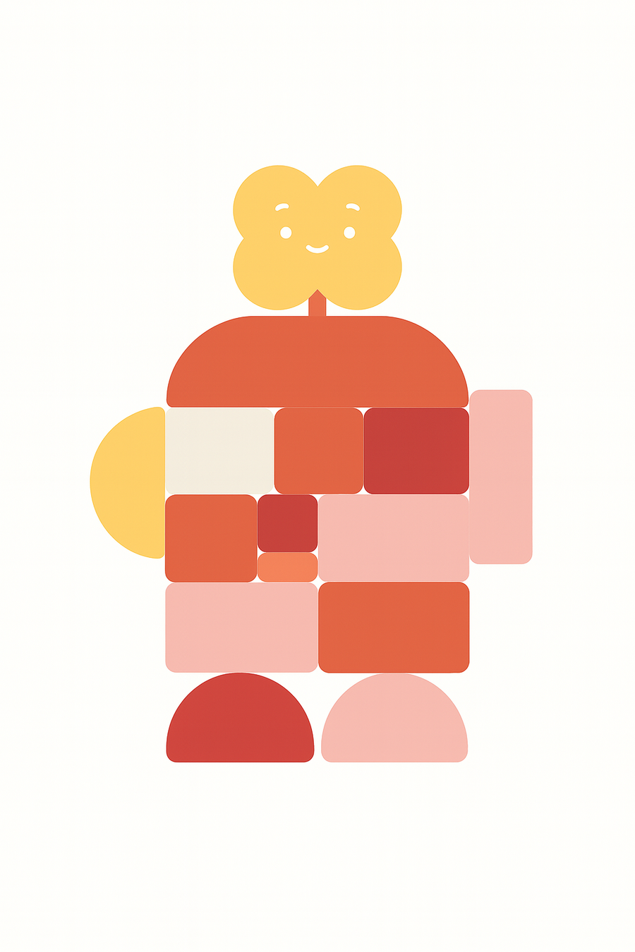 flat vector illustration of a cute minimal character built from simple geometric toy blocks. use the same soft rounded shapes as modular blocks: half-circle, rectangle, small square, and short half-circle. assemble them into a standing figure. place on top a yellow rounded «clover» shaped head with a small smiling face. use solid flat colors from this palette: A61F2B, F2C4CD, F2C36B, F2F1F0, D92525. no gradients, no outlines, clean 2D vector style, white background, balanced and friendly composition.