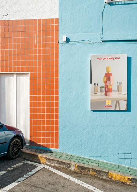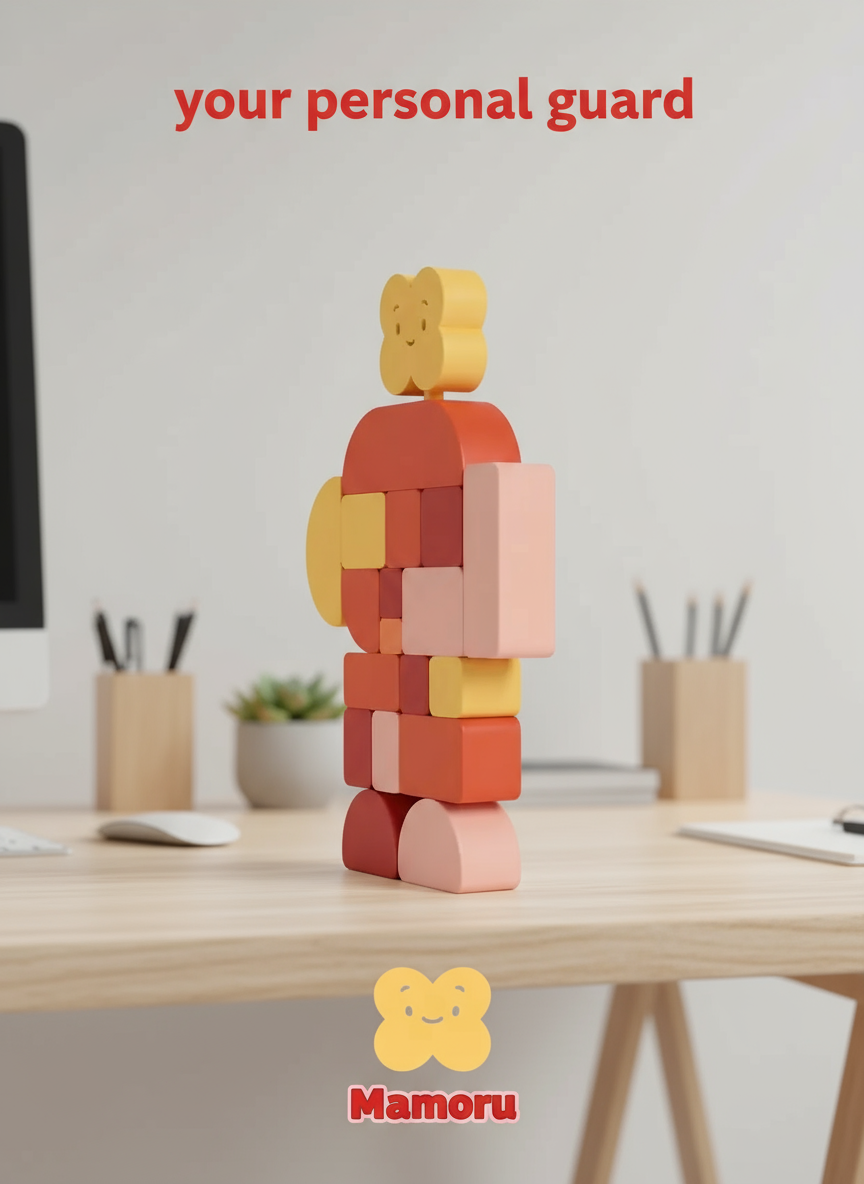 1. create a poster with this 3d figure standing on the office table in the center and the logo Mamoru at the bottom and on top should be written «your personal guard»