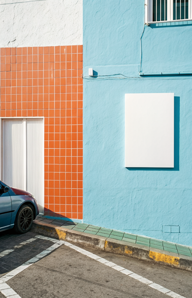 2. minimal architectural street photography of a modern building facade in bright sunlight. left side covered with orange square tiles, right side painted light blue with a white rectangular panel on the wall casting a soft shadow. part of a blue car visible in the bottom left corner, parked on a curb with green tiles and yellow paint marks. geometric composition, clean lines, vibrant colors, strong sunlight and shadow contrast, high detail, cinematic minimalism.