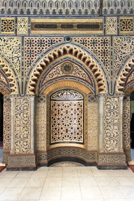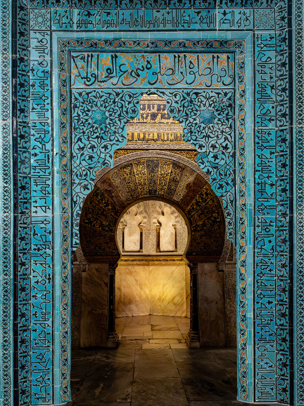 3. Михрабы Андалусии и Магриба часто характеризуются подковообразными арками и глубокой нишей, которая органично вписывается в стену мечети. Их декоративное оформление отличается насыщенной плиткой, резьбой по штукатурке, каллиграфией и детализированными геометрическими мотивами, создающими яркий визуальный эффект. Цветовая гамма контрастная и динамичная, а игра света и тени усиливает визуальное восприятие михраба, делая его выразительным центром интерьера и отражением богатой культурной традиции региона.
