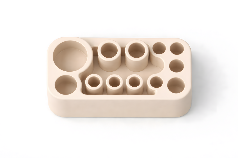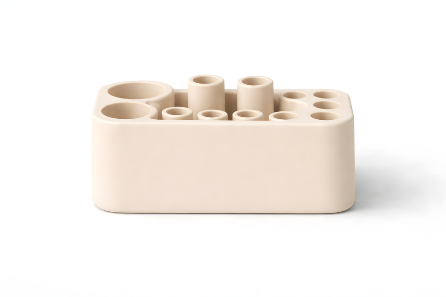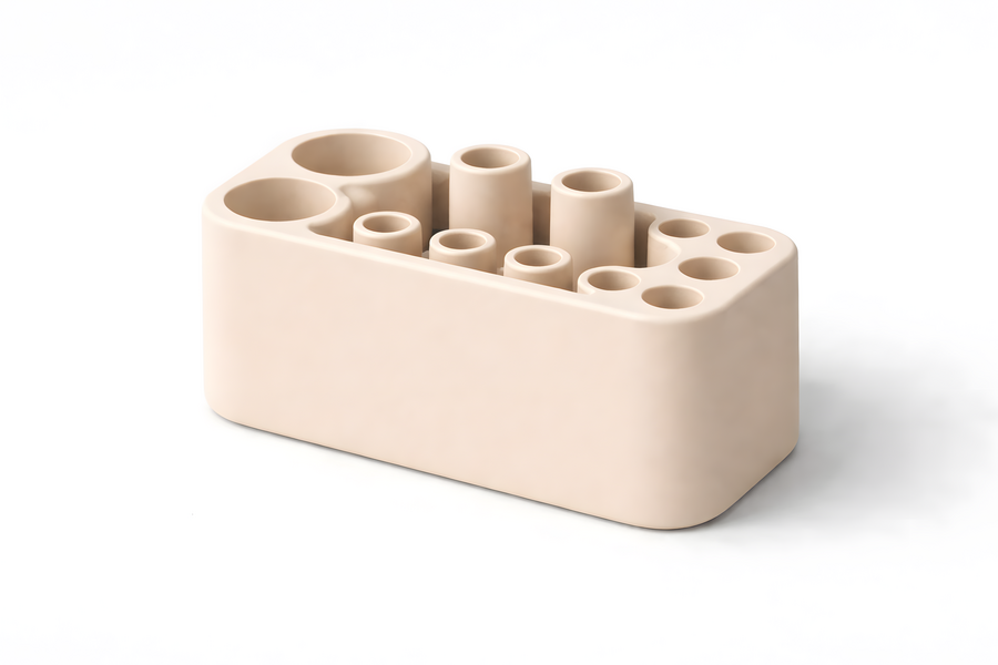 Описание Модуль содержит несколько вертикальных отверстий разного диаметра, рассчитанных на ручки, карандаши и маркеры. Различие диаметров формирует визуальный ритм и подчёркивает индивидуальность каждого предмета.