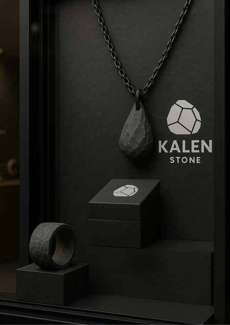 /image prompt: Create a logo for a stone jewelry brand. The brand sells real stones. The logo should be minimalist, black, and use a grotesque font with interesting details—like the cut shape of stones. The brand name is KALEN