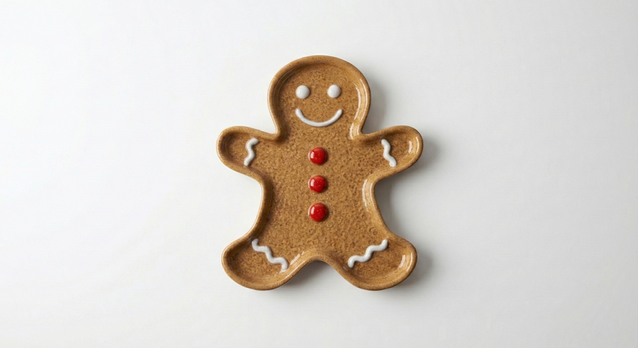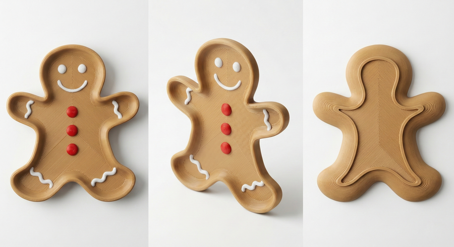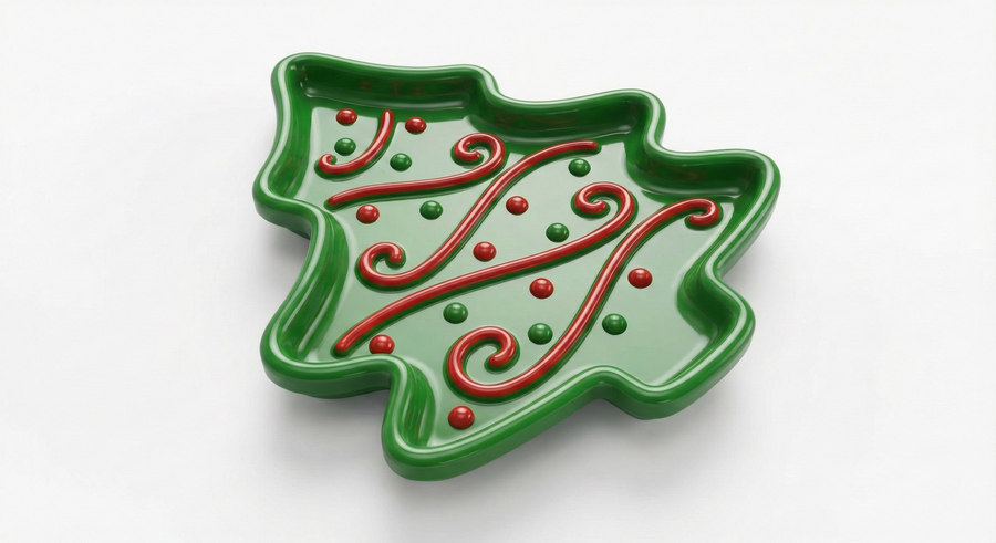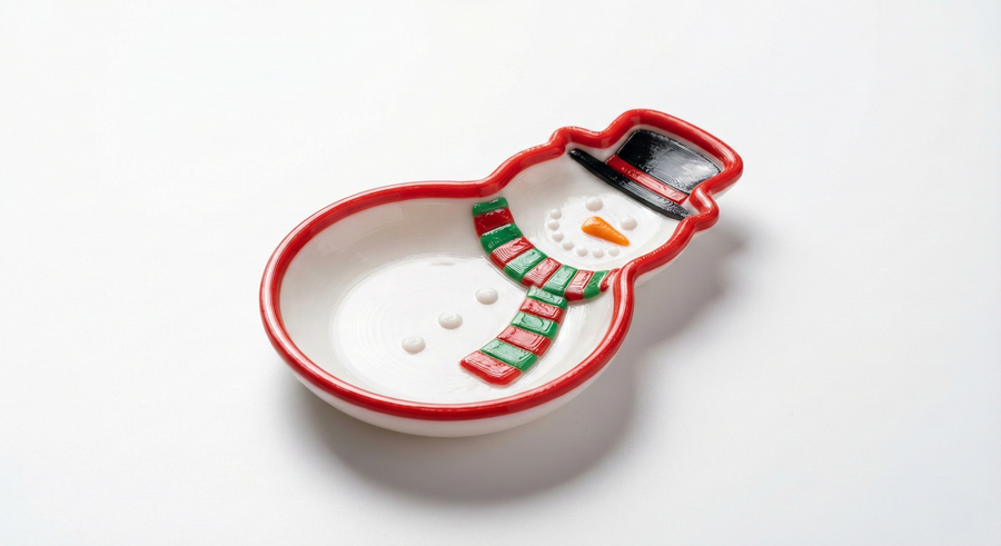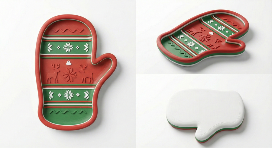clean studio product photo of a 3D-printed holiday snack plate shaped as a {gingerbread man / mitten / snowman / christmas tree / reindeer}, red-green-white palette, raised rim, shallow bowl, embossed decorative patterns, visible subtle 3D-print layer lines (FDM look) or smooth print finish, realistic plastic material, soft shadow on white background, high resolution, no text, no logos