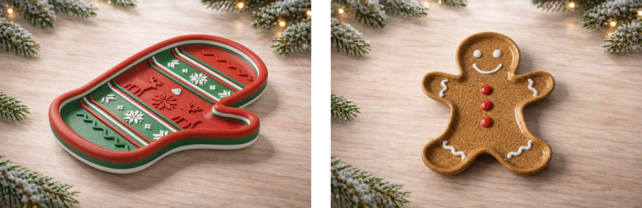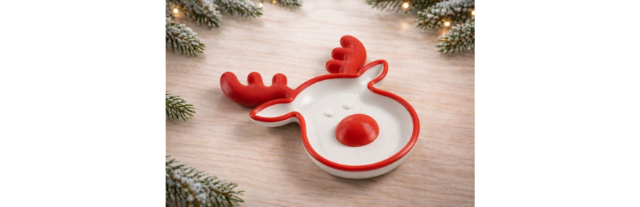 Серия «Santa plates» — набор из 5 предметов, каждый из которых выполнен в форме узнаваемого зимнего символа: пряник, варежка, снеговик, ёлка, олень. Коллекция объединена общей логикой: это не «одиночные фигурки», а единая система предметов сервировки.