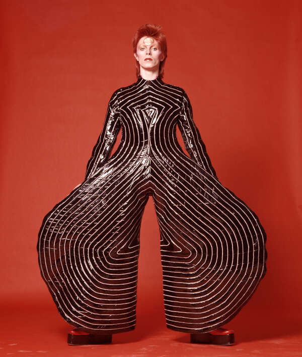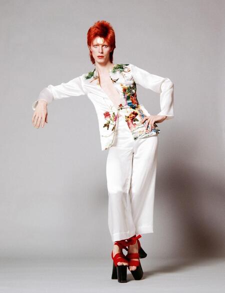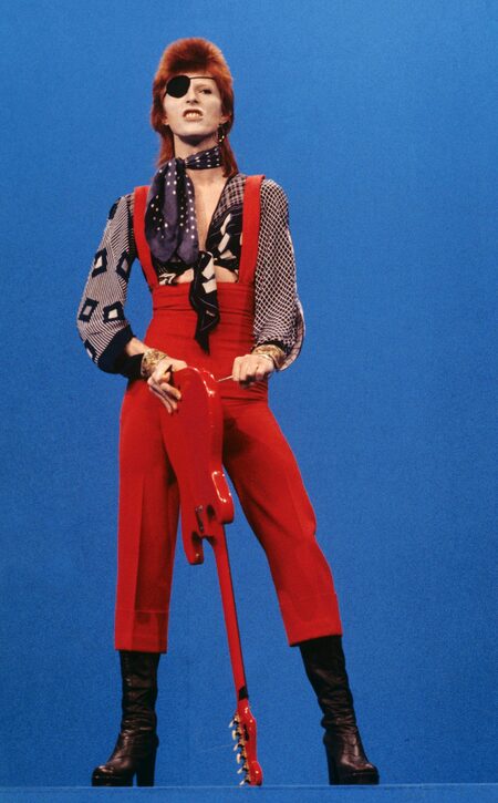 Самый узнаваемый период это эпоха Зигги Стардаста. Это время, когда Боуи смешал театр и уличную моду. В образе Зигги было всё: ярко красные волосы, грим, блестящие ткани, футуристические силуэты. Над костюмами работал японский дизайнер Кансай Ямамото, именно он помог Боуи создать тот визуальный язык, где одежда действовала как арт объект. Комбинезоны, асимметричные пропорции, всё это выглядело так, будто сошло со страниц фантастического романа.