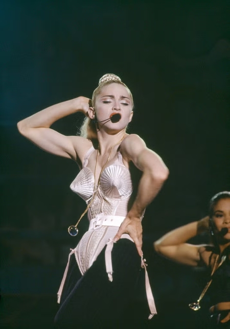 В 1990 году на своем туре Blond Ambition World Tour она вышла на сцену в знаменитом корсете бюстгалтере с конусовидными чашечками, дизайнером которого являлся Жан-Поль Готье. Этот костюм один из самых узнаваемых в истории поп культуры. Он стал олицетворением того как типично женская деталь одежды как бы превращалась в броню. Сам Готье позже вспоминал, что вдохновлялся винтажным бельём 1950-х, а идея знаменитого корсета родилась задолго до Мадонны, ещё в детстве Готье примерял подобные формы на своего плюшевого медведя Нану. Но в интерпретации Мадонны образ перерастает в символ женской силы в провокационной моде 80-х.