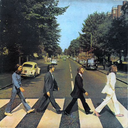 Слева — официальная обложка «Abbey Road». Справа — советский бутлег лейбла «АнТроп». Пересъём и переработка западной обложки: пример того, как в СССР переосмыслялись культовые образы рок-культуры.