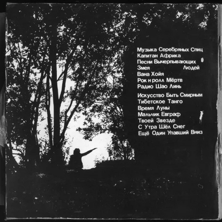 Особенно показательно, как это решение продолжено на остальных сторонах коробки. Разные варианты одного и того же ландшафта и повторяющийся силуэт создают эффект монтажной последовательности: фигура появляется на горизонте, исчезает в кустах, возникает среди деревьев рядом с трек-листом. Вместо жёсткого деления на обложку и оборотку возникает единый визуальный цикл. Из простейших технических средств — контрастного чёрно-белого изображения, дешёвой коробки, рукописного текста — Усов собирает цельную конструкцию, где пейзаж, тело музыканта и надписи работают как элементы одной истории. Поэтому «Радио Африка» часто воспринимается как вершина сюрреалистического самовыражения «Аквариума» и один из самых продуманных опытов ленинградского магнито-дизайна.