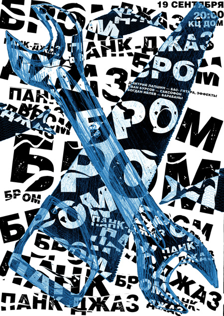 A poster for the BROM punk jazz group’s performance, reflecting the break in the template. The wrench and saws drowned in the water among the fish become a symbol of unexpected fusion: mechanics in the elements, punk in the jazz.