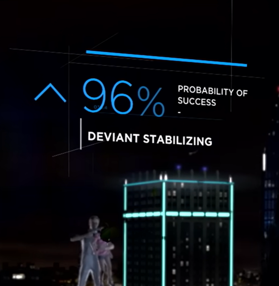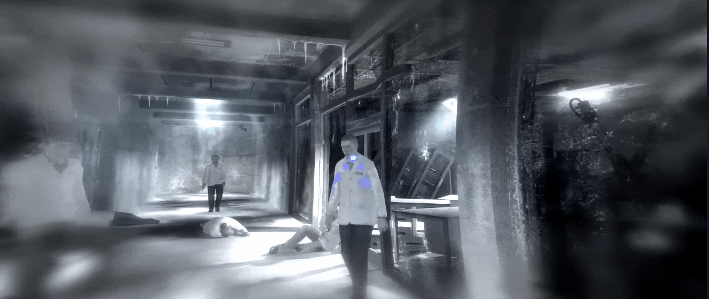 Дополнительно накладывается роль Айдена: в режимах, где игрок управляет духом, меняется не только механика, но и точка восприятия — это уже не тело, а чистое присутствие. Визуально это подчёркнуто сменой ракурсов, цветовой гаммы, костюмов и окружения (лаборатория, спецоперация, ночлежка, пустыня), а также характерным «вылетом» камеры и десатурированным зрением, когда мы становимся Айденом. Игрок всё время примеряет разные «я» внутри одной истории.