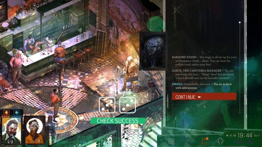 Базовая система в Disco Elysium построена на броске кубиков: каждый диалог, проверка, действие — подчинено рандомизированному результату, даже если игрок хорошо подготовился. Можно прокачать интеллект, но провалить проверку на харизму в банальной сцене. Alea здесь оформлена открыто: бросок кубов визуализирован, подсвечиваются шансы. Игра выстраивает повествование как цепь случайных отклонений, не давая контролировать даже ход мысли персонажа. Визуально это сопровождается вспышками, «тряской» интерфейса, глюками в цвете и тексте — всё подчёркивает потерю контроля.