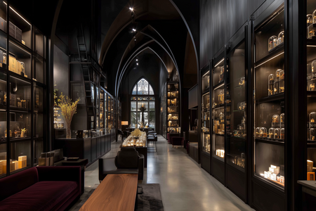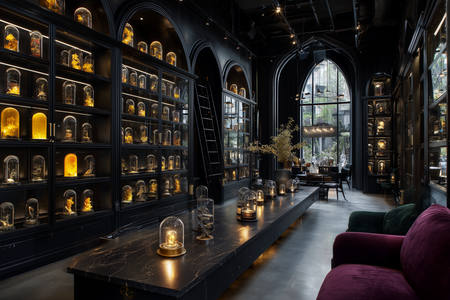Luxury boutique interior «Formalin» memory preservation store, modern Victorian cabinet of curiosities aesthetic, high ceilings 4.5 m with minimalist gothic arches, dark walnut wood paneling walls, polished concrete floors with brass inlay details, large black-framed panoramic windows, floor-to-ceiling display cabinets made of dark wood and matte black steel frames with glass vitrines, hundreds of glowing memory snow globes on individual black marble pedestals filling every shelf, each snow globe contains miniature glowing figurines inside (tiny teddy bears, small roses, medals, cameras, rings, keys), globes emit warm amber and golden light from within, some globes levitating on magnetic platforms, black metal library ladder, central live-edge wood slab table with featured glowing snow globes, emerald velvet chairs, burgundy velvet lounge seating, charcoal velvet drapes, visible workshop behind glass partition with steel workbenches, moody atmospheric lighting.
