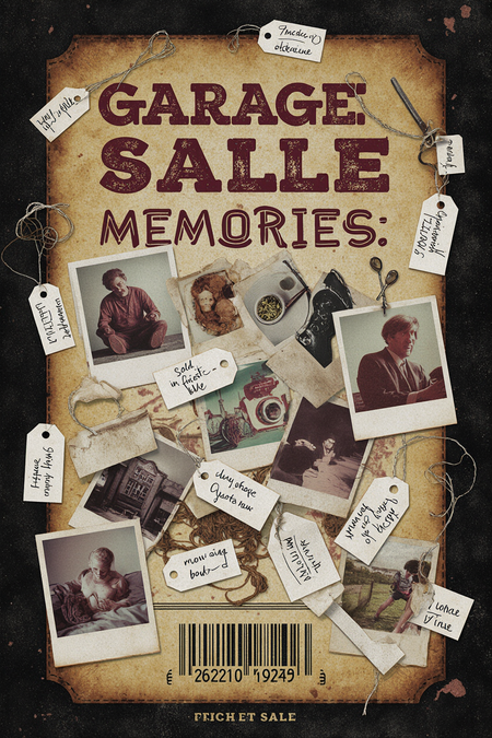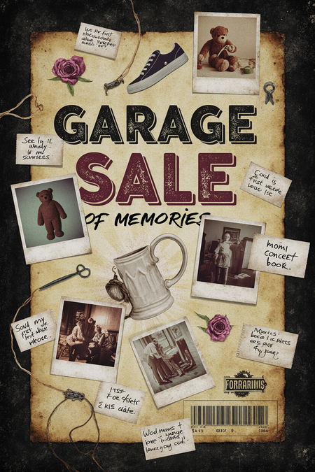 Vintage garage sale poster design for «Formalin» memory brand, brutalist typography, bold text «GARAGE SALE OF MEMORIES» in distressed sans-serif font, collage aesthetic with scattered polaroid photos of ordinary objects (old teddy bear, worn sneakers, vintage camera, house keys, coffee mug, concert ticket, dried rose), each photo has handwritten note «sold my first bike here» «mom’s recipe book» «our first date», dark moody color palette: black, deep burgundy, faded yellow, aged paper texture background, medical specimen label aesthetic, barcode elements.