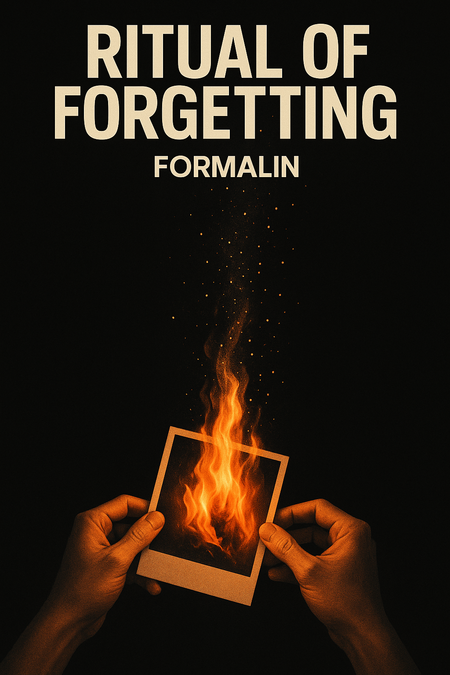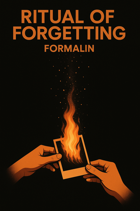 Minimalist poster design RITUAL OF FORGETTING by Formalin, central composition: hands releasing burning photograph into darkness, flames and ashes rising upward transforming into light particles, stark black background with warm orange fire glow, bold sans-serif typography at top, somber yet liberating atmosphere, high contrast, contemporary poster design