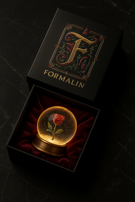 Flat lay top view, luxury black packaging box opened revealing glowing memory snow globe inside on burgundy velvet cushion, box lid placed artfully beside with «FORMALIN» gothic logo embossed in gold and burgundy on top surface, miniature rose figurine glowing inside snow globe, dark marble surface, dramatic lighting, premium unboxing aesthetic, symmetrical composition, sophisticated luxury product photography, logo clearly visible with ornate blackletter F, brass metallic accents, professional studio shot, 8k