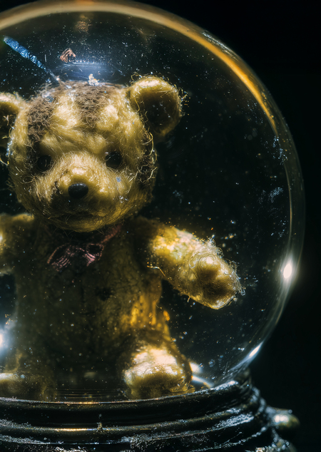 сlose-up shot of vintage memory snow globe on elaborate gothic metal stand, deep black void background, inside: luminous miniature teddy bear statuette with worn texture details, small plush toy figurine glowing with nostalgic golden light, floating snow and sparkles, old beloved toy replica clearly visible through glass, heavy ornate dark steel pedestal with gothic architectural elements, shallow depth of field, emotional atmosphere, Hasselblad camera quality, hyperrealistic, 4k