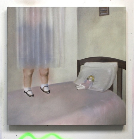 Она воспринимает образ ребенка как архетипический, чистый и яркий и считает, что детские действия часто имеют мифологический характер. В работе «Сон?» художница создает, казалось бы, типичный сюжет: девочка засыпает во время чтения. Однако от работы веет тревожностью — кожа девочки имеет зеленоватый, неестественный подтон, косы и руки странно изогнуты, а белое пространство кажется неопределенным и бесконечным, непохожим на стол, оно словно поглощает героиню, затягивая ее, как кролика в нору на книжной иллюстрации.