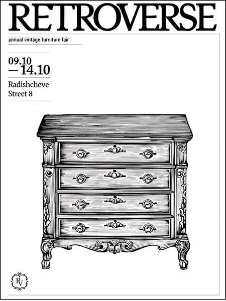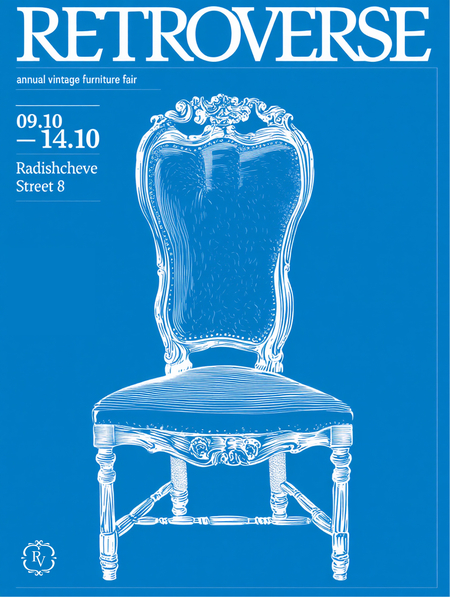 2 плакат: /imagine prompt: A vertical poster design for the project «Retroverse» — annual vintage furniture fair. The poster features a detailed black engraved illustration of a vintage wooden chair. The background is white with black serif typography. The title «RETROVERSE» appears prominently at the top in large serif letters. Below it, smaller text: «annual vintage furniture fair», and underneath: «09.10 — 14.10». Also add the address: «Radishcheve Street 8». The composition should be balanced, minimalist yet ornate, with elegant spacing and typography hierarchy. Add a logo in the lower left corner.