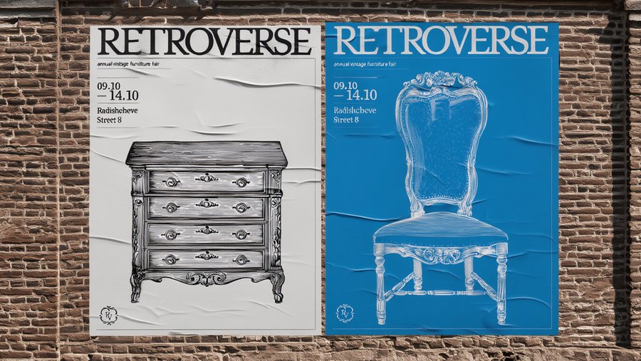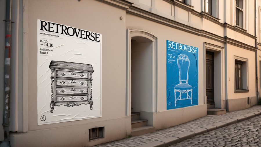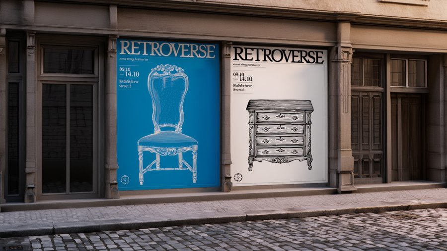 /imagine prompt: a mockup of two posters for the Retroverse vintage furniture fair. The posters are located in a city with light-colored European-style buildings.