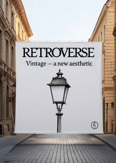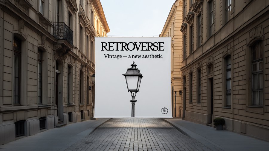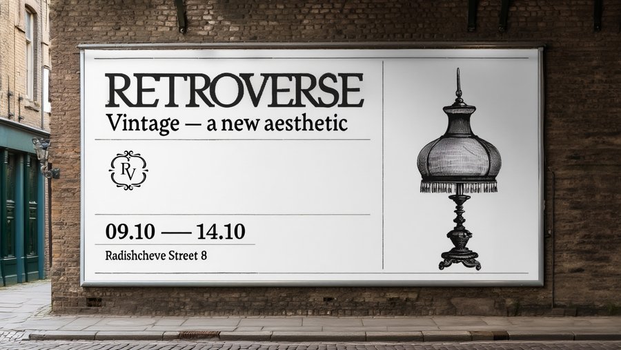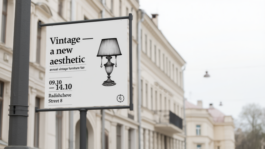 /imagine prompt: mockup of banner for the Retroverse vintage furniture fair. Use black and white colors. On the left side of the banner write in large serif letters: «Vintage — a new aesthetic». Below that, write «annual vintage furniture fair» and underneath that, write «09.10 — 14.10». At the bottom of the banner, in clean serif type, add the address: «Radishcheve Street 8». On the right side of the banner is an illustration of an old lamp in the style of engravings. The banner is located in a city with light-colored European-style buildings.